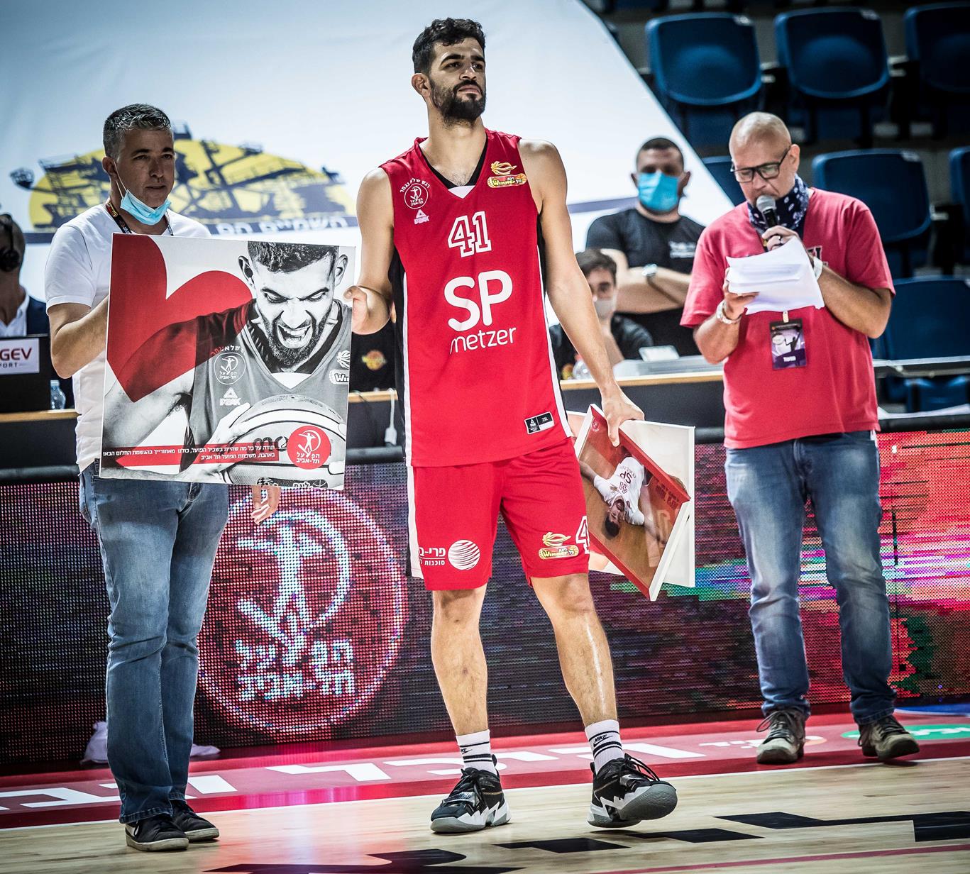גינת בטקס הפרידה ממנו לאחר המשחק (צילום: עודד קרני)