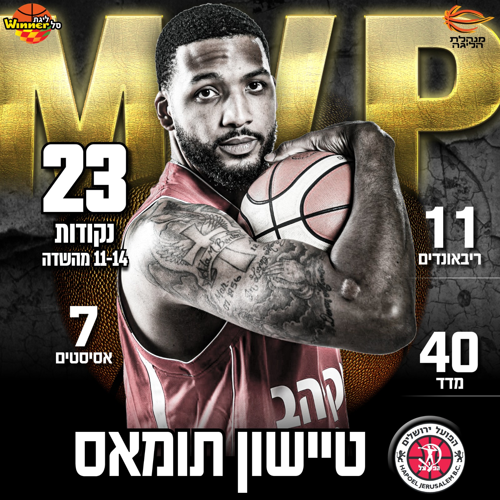 תומאס תיפקד נהדר בהרכב הגבוה של האדומים לצד סולימאן בריימו ועידן זלמנסון, מסר שיא קריירה של 7 אסיסטים ורשם שיא אישי גם במדד: 40. בנוסף הוא קלע שיא עונתי של 23 נקודות באחוזים מצוינים (11 מ-13 לשתיים), הוריד 11 ריבאונדים וכיכב בריצת 0:11 של ירושלים משלהי הרבע השלישי לתחילת הרבע הרביעי, שהפכה את התוצאה בפעם האחרונה.