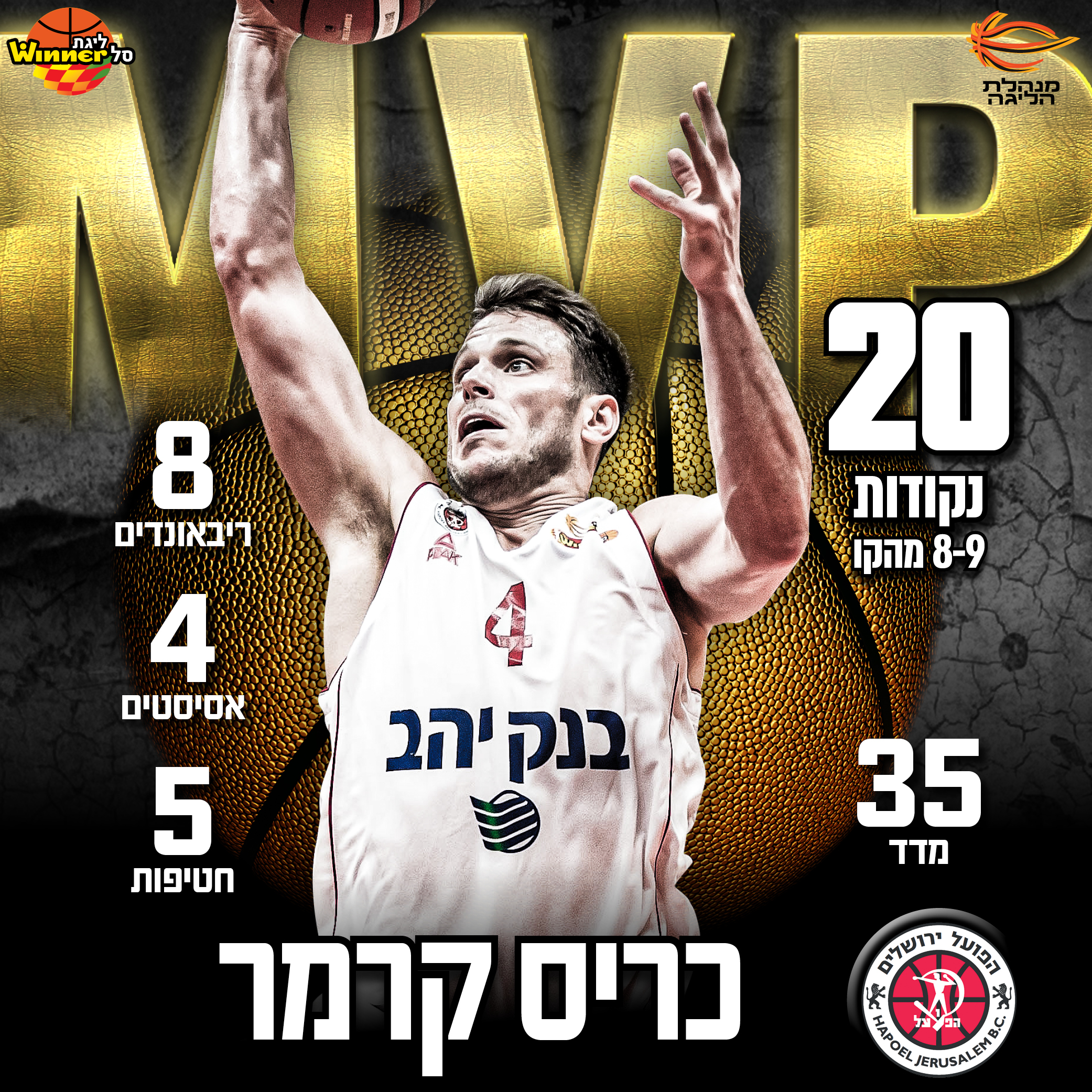 כריס קרמר בכלל לא היה בתוכניות המקוריות: הוא הגיע להפועל "בנק יהב" ירושלים ברגע האחרון של הפגרה, כמעט נחתך מכיוון שעדיין לא היה כשיר לשחק בפיינל 8 של ליגת האלופות ורק לאחרונה הוארך חוזהו עד תום העונה. אבל משבוע לשבוע מתברר שהוא אחד השחקנים הכי חשובים של מחזיקת הגביע העונה ואחרי תצוגה מרשימה נוספת הוא קוטף את תואר מצטיין המחזור השביעי בליגת ווינר סל.
