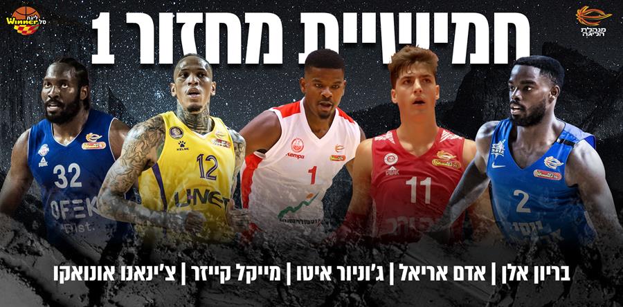 לצידו בחמישייה: אדם אריאל שסייע להפועל "בנק יהב" ירושלים לבצע מהפך ברבע הרביעי נגד הפועל "נופר אנרגיה" גליל עליון עם 17 נקודות (6-7 מהשדה), מדד 25 ופלוס-מינוס 21+; ג'וניור איטו שהוביל את קלעי הפועל "אלטשולר שחם" באר שבע בניצחון על הפועל גלבוע/גליל עם 20 נקודות; מייקל קייזר שחגג מתחת ובעיקר מעל לסלים בהצגה של הפועל "יונט" חולון מול מכבי "אפי קפיטל" ראשל"צ עם 18 נקודות, 5 דאנקים ו-4 חסימות; וצ'ינאנו אונואקו שהצטיין בניצחון בני "Ofek Dist" הרצליה על הפועל ת"א עם 20 נקודות, 12 ריבאונדים ומדד 27.