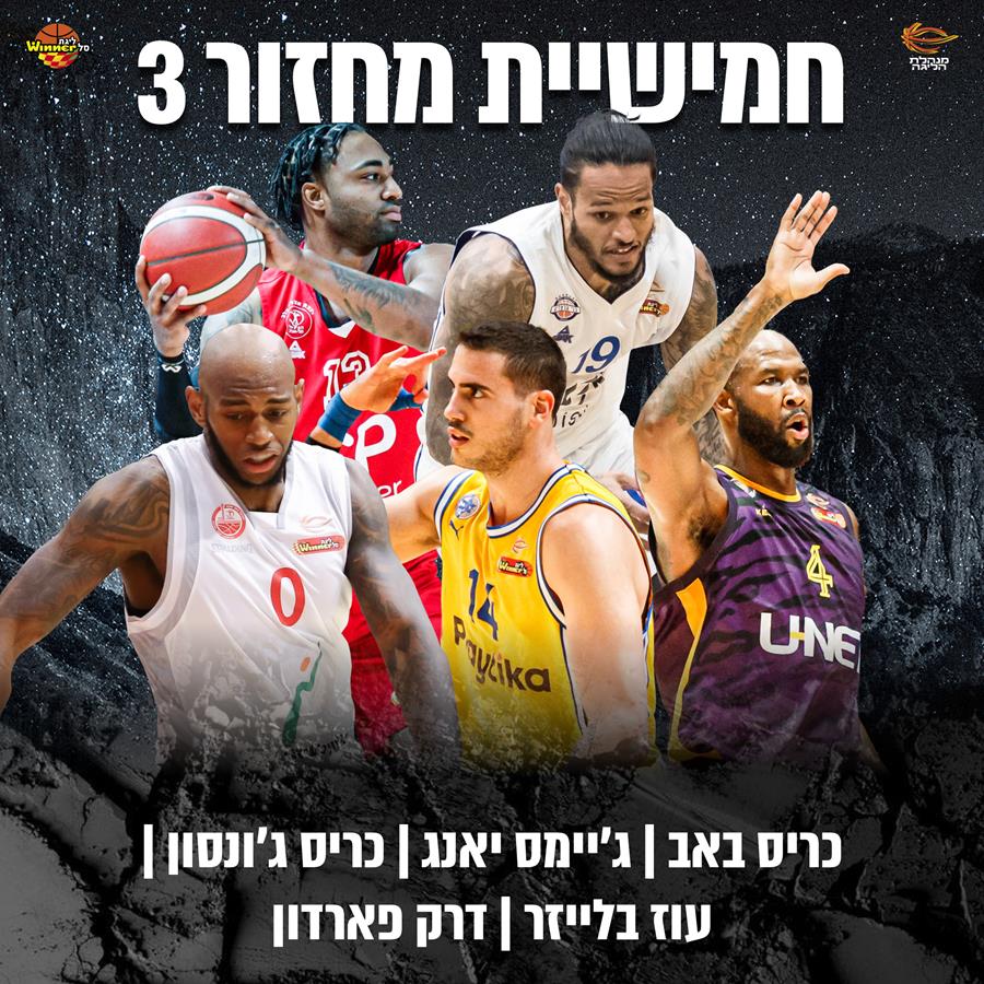 לצידו בחמישייה: ג'יימס יאנג שחימם את הידית בניצחון הבכורה של הפועל "SP מצר" ת"א עם 23 נקודות, 9 ריבאונדים ומדד 30 נגד מכבי "אפי קפיטל" ראשל"צ; כריס ג'ונסון שקלע 21 נקודות, כולל 3 המכריעות מהקו, בניצחון הדרמטי של הפועל "יונט" חולון על הפועל גלבוע/גליל; עוז בלייזר שכיכב בחגיגה של מכבי "Playtika" ת"א מול הפועל "בנק יהב" ירושלים עם 14 נקודות באחוזים מושלמים מכל הטווחים ומדד 21; ודרק פארדון, שהצטיין בניצחון של הפועל "אלטשולר שחם" באר שבע על הפועל "יוסי אברהמי" אילת בתום הארכה עם 20 נקודות, 14 ריבאונדים, 4 חטיפות ו-3 חסימות.
