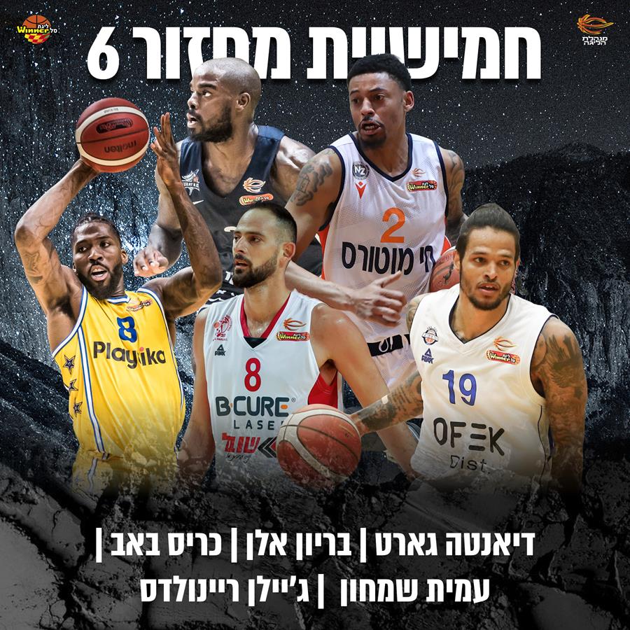 לצידו בחמישייה: דיאנטה גארט שתרם 20 נקודות ו-10 אסיסטים בניצחון השלישי ברציפות של עירוני "חי מוטורס" נס ציונה, שחזרה מבור גדול ברבע הרביעי נגד הפועל "אלטשולר שחם" באר שבע; בריון אלן שהפגיז שיא ליגה עונתי של 38 נקודות, כולל 7 מ-12 לשלוש, בהופעה אישית אדירה בהיכל מנורה מבטחים; כריס באב ששמר על המאזן החיובי של בני "Ofek Dist" הרצליה עם 22 נקודות, 6 ריבאונדים, 6 אסיסטים ומדד 30 נגד הפועל "בנק יהב" ירושלים; ועמית שמחון שהפגיז 26 נקודות (6-9 לשלוש, 4-5 לשתיים) שסייעו להפועל "בי-קיור לייזר" חיפה לסמן וי חשוב בקרב התחתית מול מכבי "אפי קפיטל" ראשל"צ.