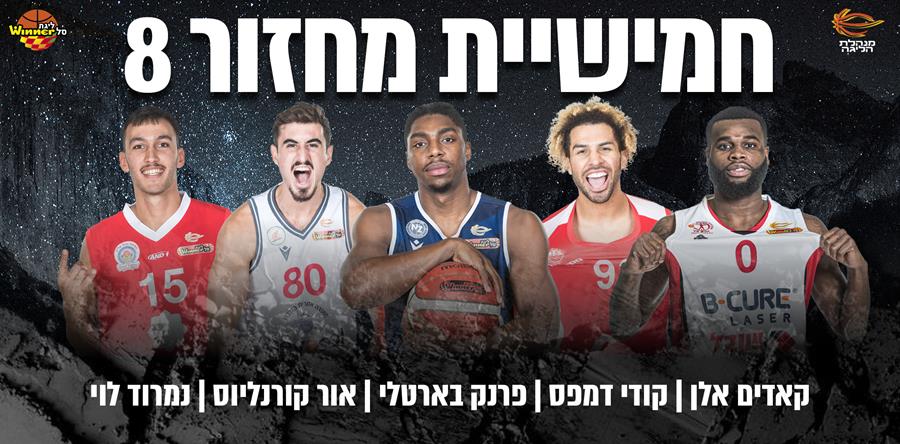 לצידו בחמישייה: קאדים אלן שהעביר הילוך במחצית השנייה וסחב את הפועל "בי-קיור לייזר" חיפה על גבו לניצחון על הפועל "יונט" חולון עם 22 נקודות ומדד 26; קודי דמפס שעלה לוהט מהספסל ועם 24 נקודות וחמש שלשות מול הפועל "SP מצר" ת"א החזיר את הפועל "אלטשולר שחם" באר שבע למסלול הניצחונות; פרנק בארטלי שעזר לעירוני "חי מוטורס" נס ציונה הלוהטת לברוח למכבי "Playtika" ת"א עם 21 נקודות ו-5 אסיסטים; ואור קורנליוס שעם שיא קריירה של 20 נקודות (4-6 לשלוש) התחיל את המהפך של הפועל גלבוע/גליל ממינוס 15 לניצחון חוץ על מכבי "אפי קפיטל" ראשל"צ.