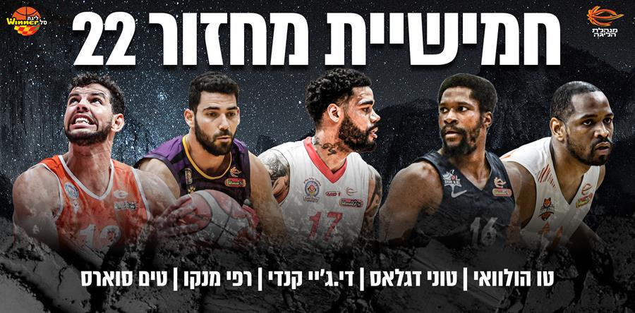 לצידו בחמישייה: טו הולוואי שהוביל את מכבי "אפי קפיטל" ראשל"צ לניצחון מפתיע על הפועל "בנק יהב" ירושלים עם 17 נקודות, 9 אסיסטים, 3 חטיפות ומדד 25; טוני דגלאס שכיכב בניצחון החוץ הראשון של הפועל "יוסי אברהמי" אילת על הפועל "אלטשולר שחם" באר שבע עם 19 נקודות, 5 מ-10 לשלוש ו-5 אסיסטים; רפי מנקו שקלע 12 נקודות (3 מ-6 לשלוש), הוריד 13 ריבאונדים וסיים עם המדד הכי גבוה בהפועל "יונט" חולון (21) בניצחון החוץ החשוב על בני "Ofek Dist" הרצליה; וטים סוארס מעירוני "חי מוטורס" נס ציונה ששוב להט נגד הפועל גלבוע/גליל עם 19 נקודות, 3 מ-4 לשלוש, 11 ריבאונדים, מדד 26 ופלוס-מינוס 19+.