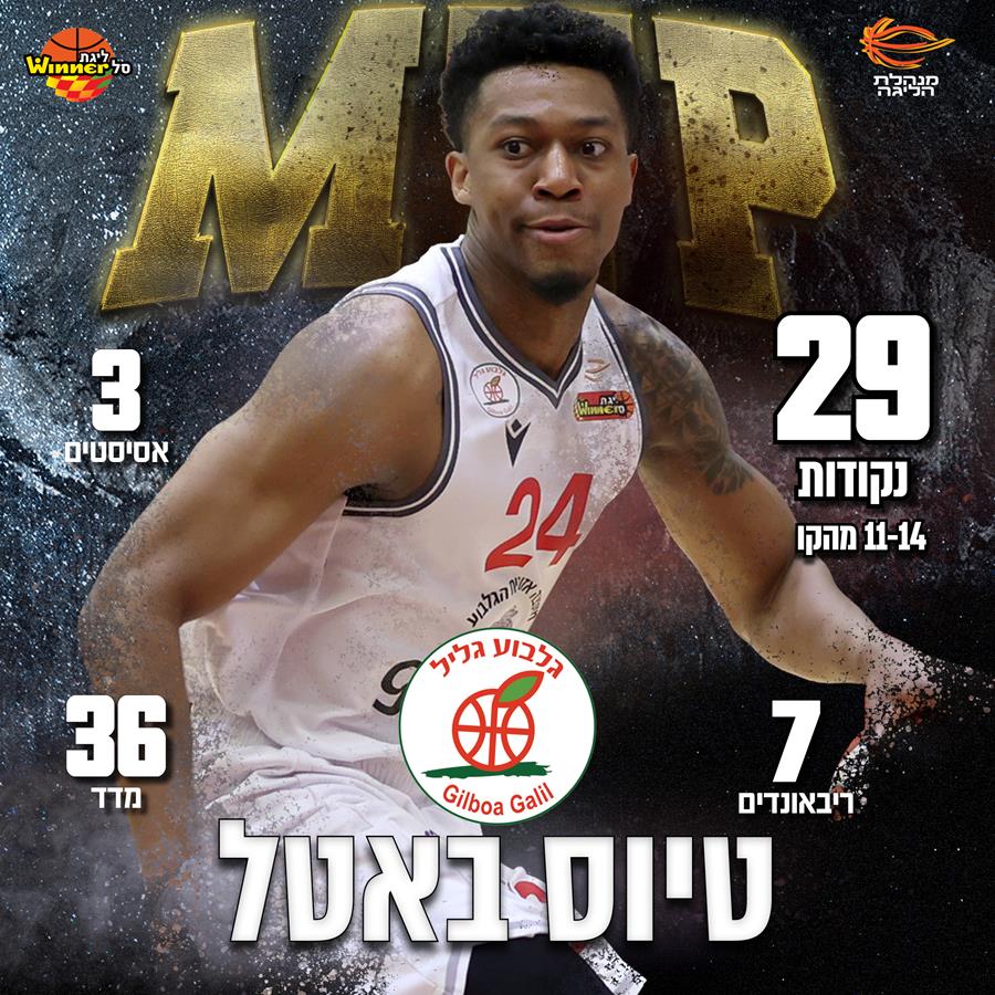 באטל היה חד ומדויק מהרגע הראשון, ויתר מראש על הניסיונות מעבר לקשת שלא הצליחו לו לאחרונה ולקח את הכדור לטבעת באגרסיביות, מה שהביא אותו לקו פעם אחר פעם (11 מ-14 במצטבר). הוא סיים עם 29 נקודות, שיא קריירה כמקצוען, 7 ריבאונדים, 3 אסיסטים ומדד 36 – הנתון הכי גבוה לשחקן של גלבוע/גליל העונה. הוא העניק לקבוצתו יתרון מוקדם עם 15 נקודות במחצית הראשונה והתעלה גם בדקות הסיום עם 11 נקודות ברבע הרביעי.