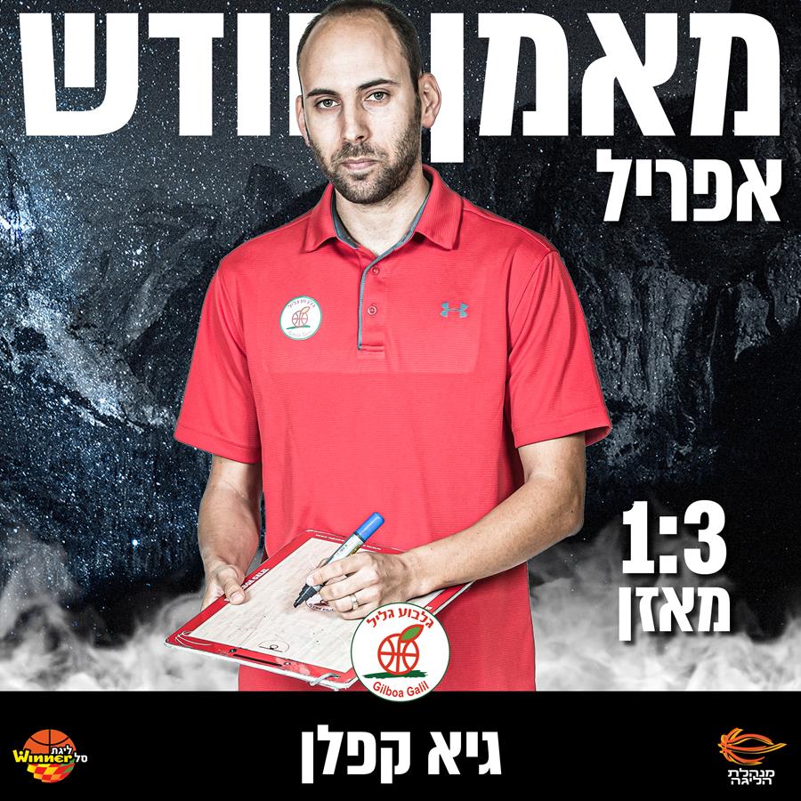 אחרי לא מעט שנים מאחורי הקלעים כעוזר מאמן במספר קבוצות, גיא קפלן קפץ העונה לקידמת הבמה כמאמן הראשי של הפועל גלבוע/גליל. הקבוצה עברה לא מעט רגעים קשים העונה ובשלבים מסוימים היא נכללה במאבק נגד הירידה, אבל לישורת האחרונה של העונה היא מגיעה בכושר שיא ומוכנה להופעה נוספת בפלייאוף. המאמן הצעיר קיבל את ההכרה על התקופה הנפלאה של קבוצתו ונבחר למאמן חודש אפריל בליגת ווינר סל. הוא הקדים במשאל את אבי אבן ממכבי "Playtika" ת"א ואריאל בית הלחמי מהפועל "יוסי אברהמי" אילת.