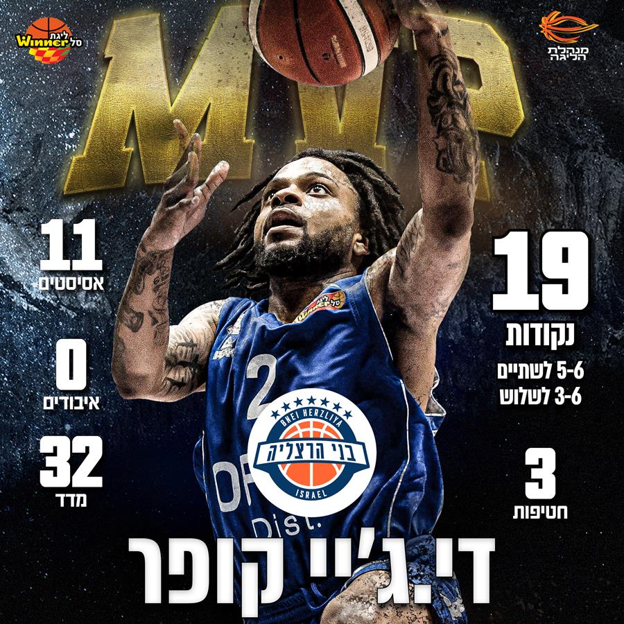 בחודשיים שהוא נמצא בארץ, למדנו שדי.ג'יי קופר הוא מוסר איכותי במיוחד: עם 99 אסיסטים בעשרה משחקים, הוא עומד על הממוצע הכי גבוה בהיסטוריה של ליגת ווינר סל. השבוע בהיכל טוטו, גילינו שהוא גם מסוגל לקלוע כשצריך: הרכז האמריקאי בן ה-31 הגיע בפעם השנייה העונה לדו-ספרתי ועם שיאי עונה של 19 נקודות ומדד 32, הוביל את בני "Ofek Dist" הרצליה לניצחון החוץ השני שלה על הפועל "יונט" חולון במאה ה-21, בדרך להבטחת המקום השלישי לפחות ולזכייה בתואר מצטיין המחזור ה-26.