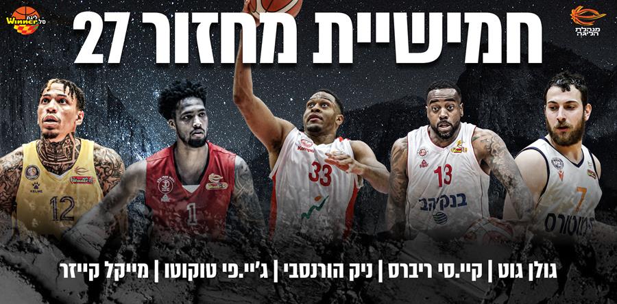 לצידו בחמישייה: קיי.סי ריברס שרשם שיאי עונה של 18 נקודות, 4 מ-6 לשלוש, 6 אסיסטים ומדד 26 עבור הפועל "בנק יהב" ירושלים בניצחון בהארכה בחוץ על בני "Ofek Dist" הרצליה; ניק הורנסבי שבמשחקו השלישי בלבד העונה העמיד טריפל דאבל של 20 נקודות, 12 ריבאונדים ו-12 אסיסטים עבור הפועל "אלטשולר שחם" באר שבע נגד מכבי "אפי קפיטל" ראשל"צ; ג'יי.פי טוקוטו מהפועל "SP מצר" ת"א ששבר את שיאיו העונתיים עם 25 נקודות ומדד 40 נגד האקסית הפועל "יוסי אברהמי" אילת ורשם דאבל-דאבל שלישי ברציפות עם 13 ריבאונדים; ומייקל קייזר שהעניק להפועל "יונט" חולון יתרון משמעותי מתחת לסלים במשחק המוקדם מול הפועל "בי-קיור לייזר" חיפה עם 15 נקודות, 10 ריבאונדים, 3 חסימות ופלוס-מינוס 16+.