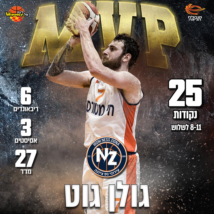 אחרי שתי תצוגות קליעה לא טובות של 0 מ-7 במצטבר לשלוש, גולן גוט הרגיש חייב לעירוני "חי מוטורס" נס ציונה במשחק הסיום של העונה. הסווינגמן חזר לחמישייה במקום ליאור קררה הפצוע ועם 25 נקודות, כולל שיא קריירה של 8 שלשות ב-73%, הוביל את הכתומים לניצחון על הפועל גלבוע/גליל וזכה בתואר השחקן המצטיין של המחזור ה-27 בליגת ווינר סל.