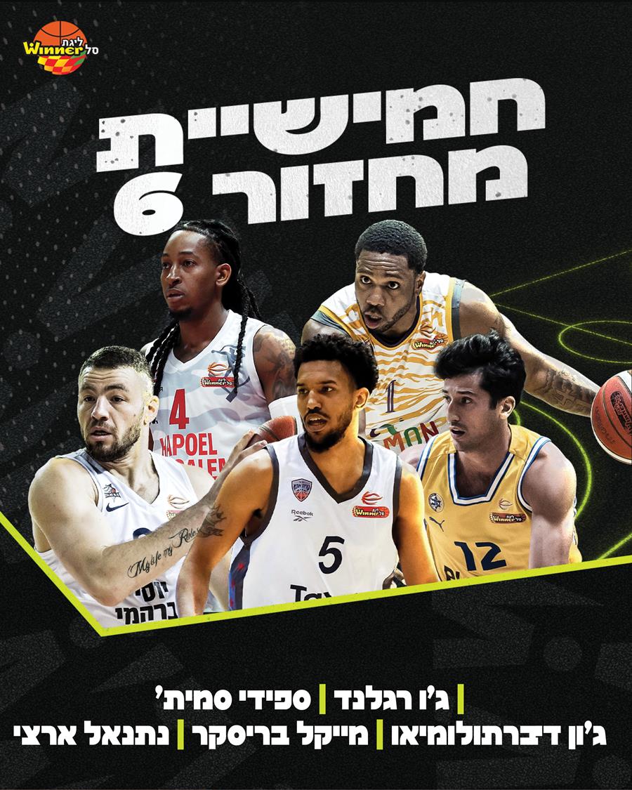 לצידו בחמישייה: ג'ו רגלנד מהפועל "עצמון" חולון שקלע 18 נקודות ומסר שיא מועדון של 16 אסיסטים מול עירוני "חי מוטורס" נס ציונה; ג'ון דיברתולומיאו שכיכב בדרבי עם 18 נקודות, 4 מ-6 לשלוש ופלוס-מינוס 25+ עבור מכבי "Playtika" ת"א נגד הפועל "Vegan Friendly" ת"א; מייקל בריסקר שצלף 23 נקודות כולל 5 מ-6 לשלוש בניצחון המרשים של עירוני "Tax:on" קריית אתא על הפועל "בי-קיור לייזר" חיפה; ונתנאל ארצי שחגג נגד האקסית הפועל גלבוע גליל עם 19 נקודות, 5 אסיסטים ומדד 21 בניצחון החוץ הראשון של הפועל "יוסי אברהמי" אילת העונה.