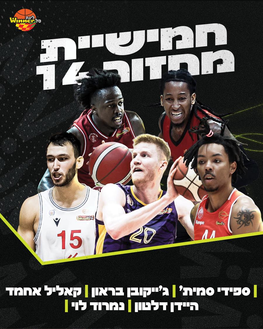 לצידו בחמישייה: ספידי סמית' שלהט עם 28 נקודות, 6 מ-9 לשלוש, 6 אסיסטים, מדד 30 ושלשת קלאץ' בהארכה, שהעניקה להפועל "בנק יהב" ירושלים ניצחון דרמטי על בני "Ofek Dist" הרצליה; קאליל אחמד שקלע 18 מ-28 נקודותיו ברבע האחרון, בדרך לניצחון בית נוסף של הפועל "אלטשולר שחם" באר שבע/דימונה, הפעם על הפועל "יוסי אברהמי" אילת; היידן דלטון שהוביל את קלעי הפועל "עצמון" חולון בחוץ מול עירוני "חי מוטורס" נס ציונה עם 23 נקודות, לצד 10 ריבאונדים ו-3 חסימות; ונמרוד לוי, שהצטיין בניצחון הפועל "נופר" גליל עליון בדרבי המקומי מול הפועל גלבוע גליל עם 18 נקודות, 7 ריבאונדים ו-5 אסיסטים.