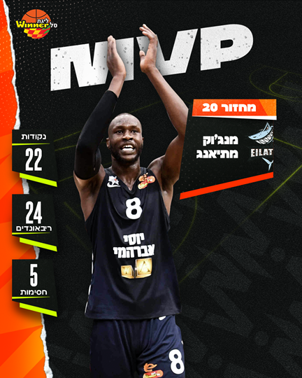 בארבעת משחקיו הראשונים בישראל, מנגוק מתיאנג התרכז בריבאונדים: 51 בסך הכל, לעומת 33 נקודות. ברבע הרביעי ברוממה, הוא כבר הראה שהוא גם יודע לסיים מצוין בצבע עם שלושה סלים חשובים שעזרו להבטיח את הניצחון – והשבוע התפוצץ בניצחון הבית הגדול על הפועל "עצמון" חולון. 22 נקודות כמעט בלי החטאה (10 מ-12 מהשדה), שיא מועדון ושיא ליגה עונתי של 24 ריבאונדים, 5 חסימות (שווה לשיא הליגה העונתי) ומדד 44 (שיא ליגה עונתי גם כן) היו לביג מן של הפועל "יוסי אברהמי" אילת, שקוטף את תואר מצטיין המחזור ה-20 בליגת ווינר סל.