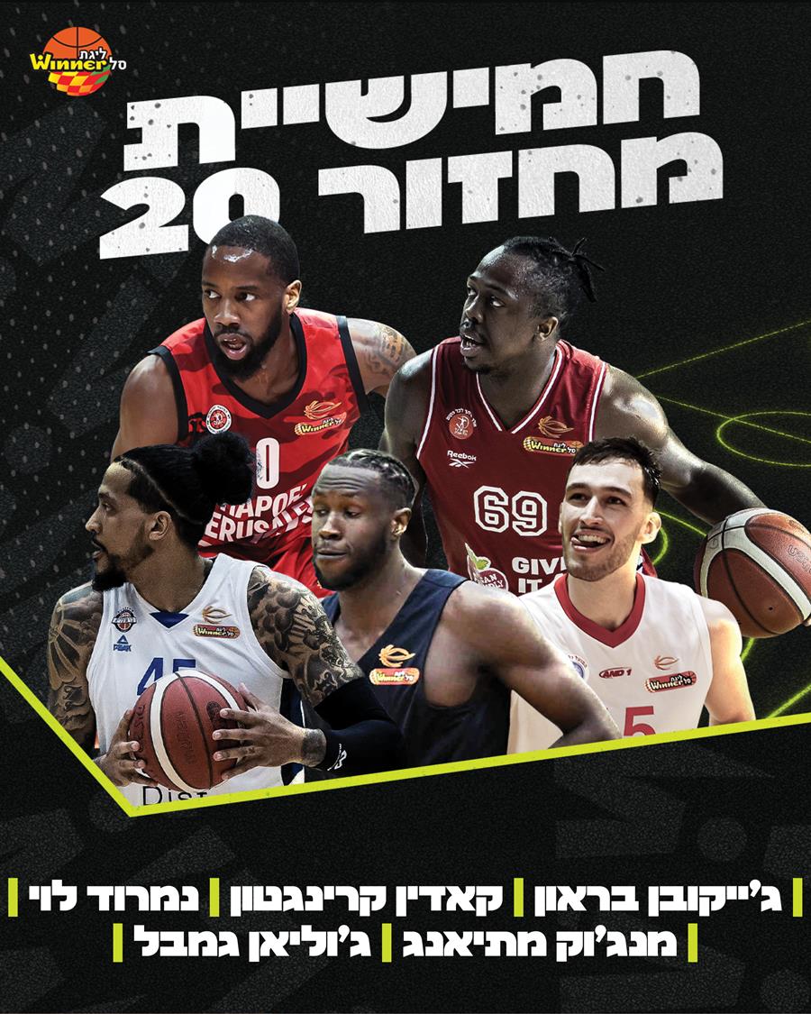 לצידו בחמישייה: ג'ייקובן בראון שפלירטט עם טריפל דאבל בניצחון הפועל "Vegan Friendly" ת"א על הפועל "בי-קיור לייזר" חיפה עם 18 נקודות, 8 ריבאונדים ו-8 אסיסטים ללא אף איבוד; קאדין קרינגטון שעלה לוהט מהספסל של הפועל "בנק יהב" ירושלים עם 27 נקודות ושש שלשות ב-27 דקות בניצחון החוץ הנוח על עירוני "Tax:on" קריית אתא; נמרוד לוי שרשם שיאים עונתיים של 25 נקודות ו-16 ריבאונדים נגד הפועל "אלטשולר שחם" באר שבע/דימונה והבטיח את מקומה של הפועל "נופר" גליל עליון בבית העליון גם העונה; וג'וליאן גמבל, שהוביל את בני "Ofek Dist" הרצליה לניצחון חשוב בהארכה על עירוני "חי מוטורס" נס ציונה במשחק מוקדם, עם 26 נקודות, 14 ריבאונדים ומדד 36.