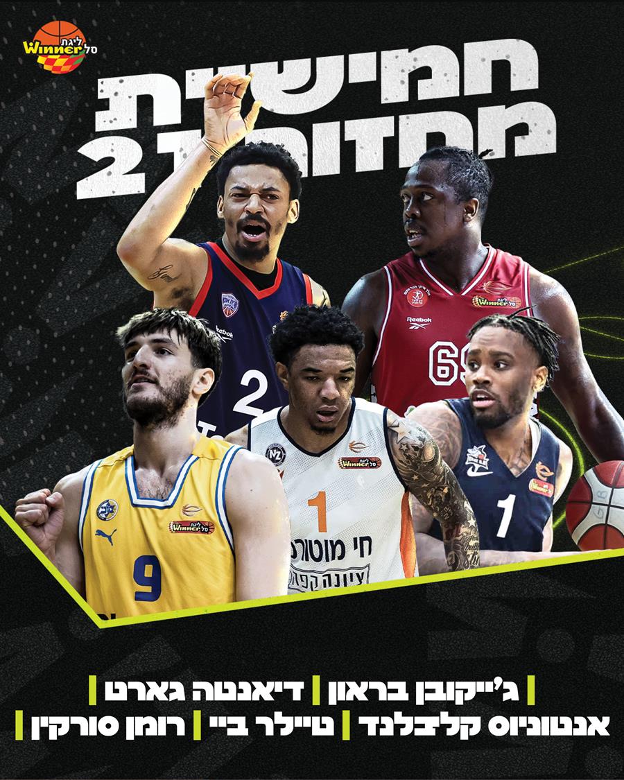 לצידו בחמישייה: דיאנטה גארט שקלע שיא עונתי של 24 נקודות בקרב התחתית הלוהט בין עירוני "Tax:on" קריית אתא מול הפועל גלבוע גליל; אנטוניוס קליבלנד עם דאבל-דאבל ראשון במדי הפועל "יוסי אברהמי" אילת: 25 נקודות ו-10 ריבאונדים בדרך לניצחון רביעי ברציפות מול הפועל "נופר" גליל עליון; טיילר ביי שהוביל את עירוני "חי מוטורס" נס ציונה בניצחון החשוב על הפועל "אלטשולר שחם" באר שבע/דימונה עם 24 נקודות, 7 ריבאונדים ו-4 אסיסטים; ורומן סורקין שחגג מתחת לסלים עם 15 נקודות, 7 מ-9 לשתיים, 8 ריבאונדים ומדד 23 בניצחון החוץ של מכבי "Playtika" ת"א על הפועל "עצמון" חולון.