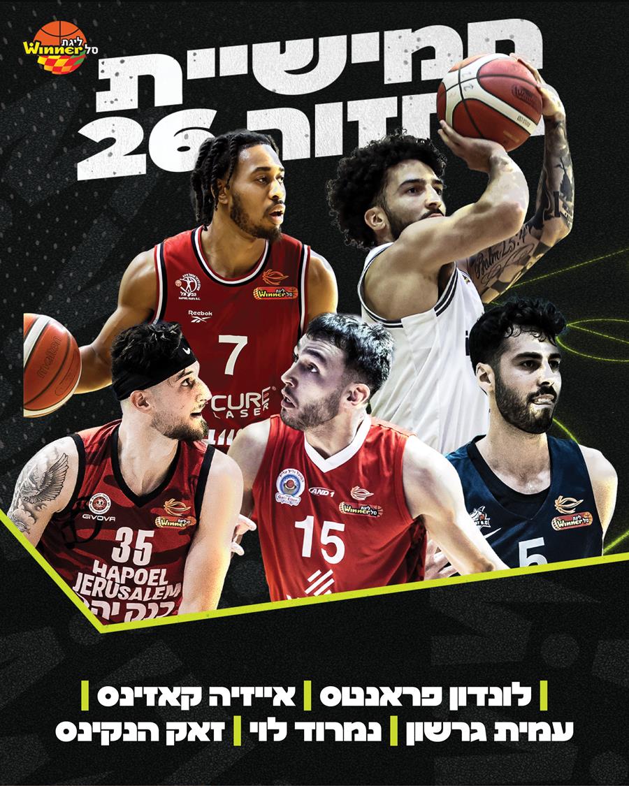 לצידו בחמישייה: לונדון פראנטס שעזר להפועל גלבוע גליל לקטוע את רצף ההפסדים עם 26 נקודות, 9 אסיסטים ומדד 28 נגד הפועל "אלטשולר שחם" באר שבע/דימונה; אייזיה קאזינס שהשכיח את מכת הפציעות של הפועל "בי-קיור לייזר" חיפה עם שיאי קריירה של 24 נקודות, 7 אסיסטים ומדד 30 נגד עירוני "Tax:on" קריית אתא; עמית גרשון שחזר לחמישייה של הפועל "יוסי אברהמי" אילת ותרם 17 נקודות, 6 ריבאונדים, 4 אסיסטים ומדד 24 בניצחון על בני "Ofek Dist" הרצליה; ונמרוד לוי שהצטיין בניצחון החוץ המרשים של הפועל גליל עליון על מכבי "Playtika" ת"א עם 15 נקודות, 7 ריבאונדים, מדד 22 ופלוס-מינוס 20+.