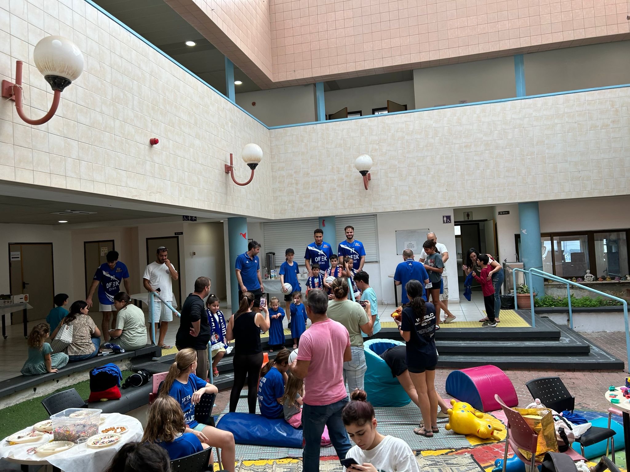 שחקני בני "Ofek Dist" הרצליה, ביחד עם הצוות המקצועי, הגיעו למתנ"ס שמפעילה העירייה למען משפחות מעוטף עזה, שיחקו עם הילדים וחילקו להם כדורים וציוד