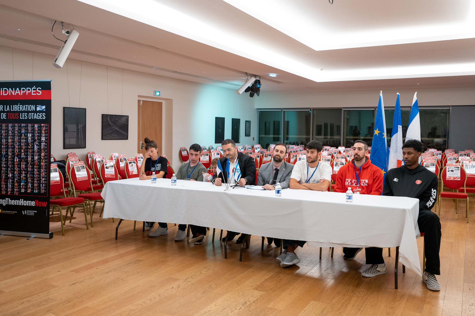 במסיבת העיתונאים נשאו דברים בעלי הקבוצה עופר ינאי, הקפטן בר טימור וכן גיא מוזס, ירדן ליבשטיין, נעמה בכר וגל צור - תושבי העוטף שבני משפחותיהם וחבריהם נפגעו באירועי השבעה באוקטובר - אשר סיפרו עדות ממקור ראשון אודות אירועי הזוועה שחוו. המשתתפים הם חלק מקבוצת האוהדים תושבי העוטף שליוותה את המשלחת האדומה בבירת צרפת.