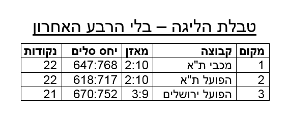 אין רבע דל. בטבלת הליגה, הפועל "SP מצרפלס" תל אביב מדורגת במקום התשיעי, עם ניצחון אחד בלבד מעל מכבי קריית גת והפועל "הכשרה ביטוח" חולון. לעומת זאת, אם היו משחקים העונה רק 30 דקות, היא הייתה מדורגת במקום השני במאזן 2:10, בדיוק כמו ל"מוליכה", מכבי "FOX" ת"א, שכמוה הובילה בכל משחקיה בתום הרבע השלישי פרט לשניים. הפועל "בנק יהב" ירושלים "דורגה ראשונה" גם בטבלת 30 הדקות עד שני המחזורים האחרונים, בהם פיגרה גם בהרצליה וגם באשדוד.
