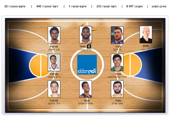 רבינוביץ זכה בתואר השבועי בזכות מספר הימורים מעניינים. הוא בחר כקפטן את דריל מונרו שחזר לעצמו אחרי תקופה פחות טובה והעניק לו 72 נקודות, הלך על גל מקל כבר בפרמיירה וקיבל ממנו 35 נקודות וגם באנקרים כמו שון דאוסון (30) ואלאדה אמינו (37) לא איכזבו. מי שעשה עבורו את ההבדל היה ווילי וורקמן, שרשם את משחקו הטוב ביותר העונה וזיכה אותו ב-24 נקודות. גם הבחירה ברמי הדר שניצח את האלופה בחוץ ראויה למחמאות. עוד בקבוצה: ג'ון דיברתולומיאו (14), כרם משעור (9) ונאור שרון (2).