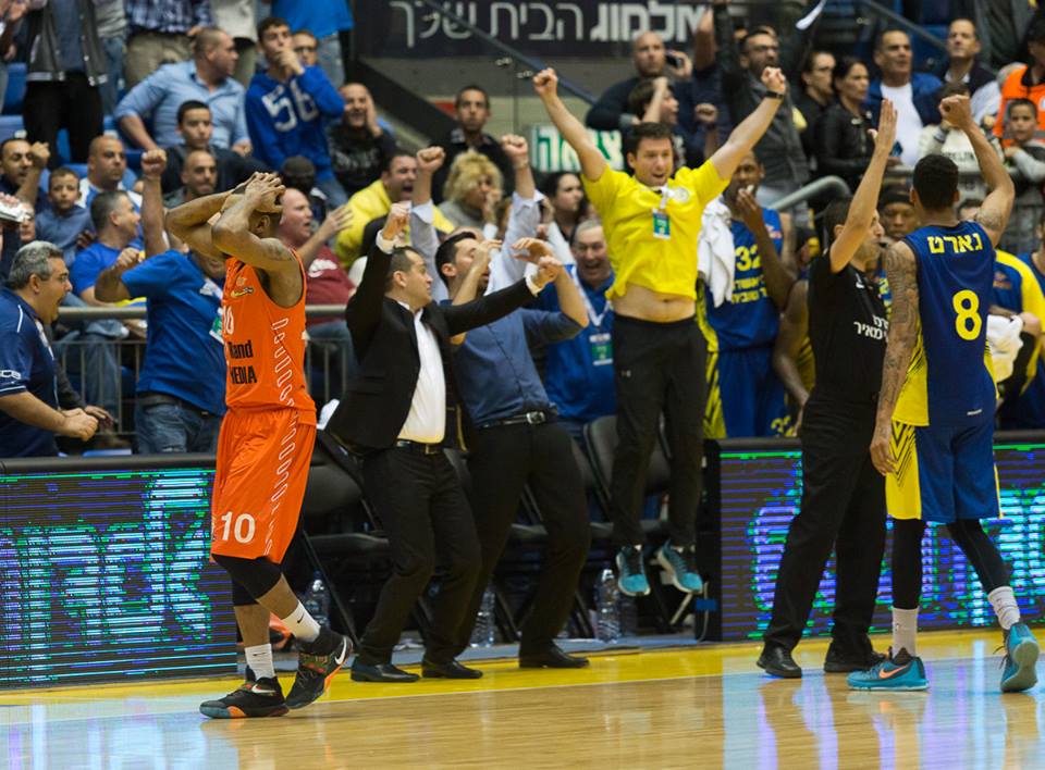 גארט והספסל האשדודי חוגגים, ליונס תופס את הראש (צילום: עודד קרני, איגוד הכדורסל)