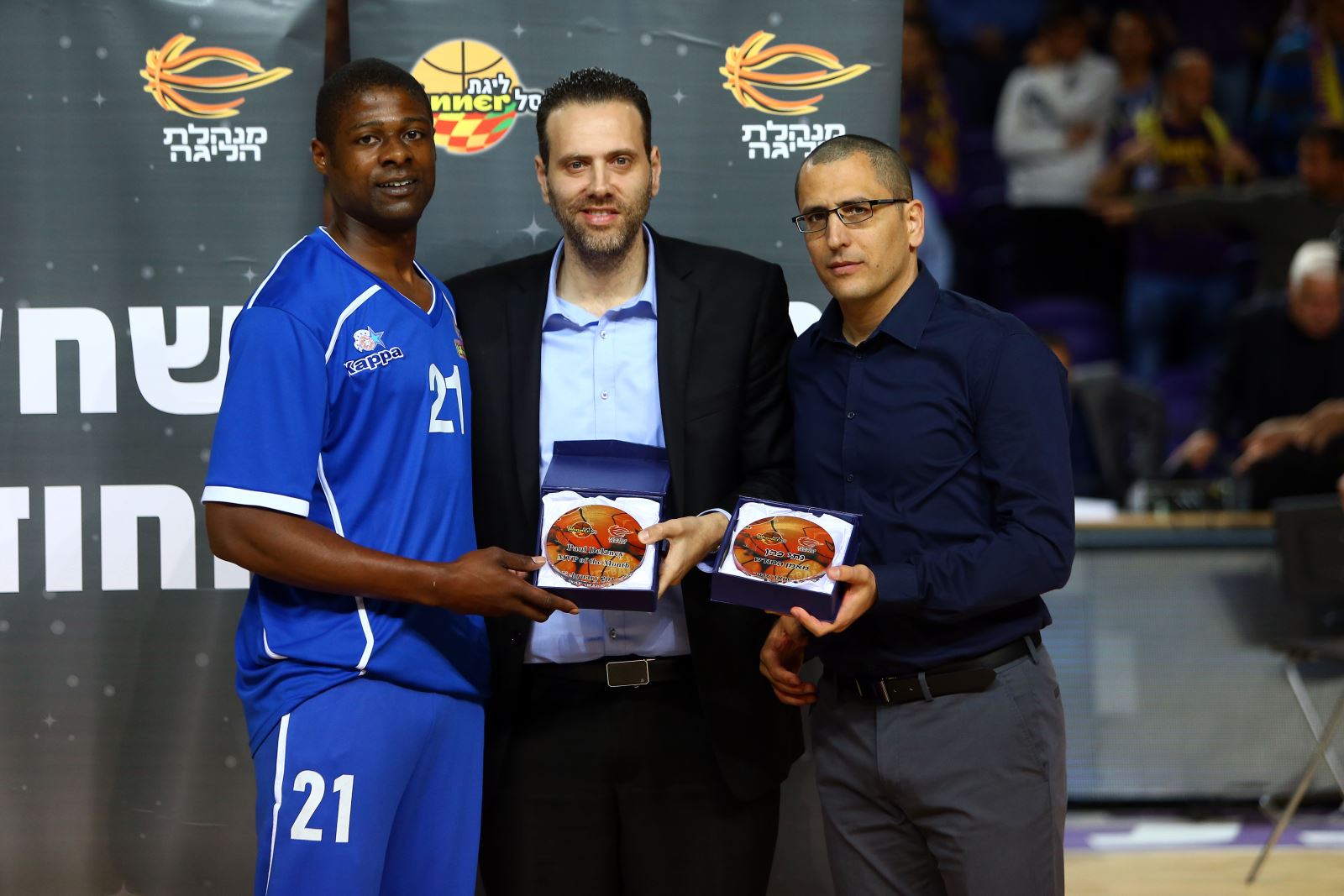 נתי כהן ופול דילייני מקבלים את תארי מאמן ושחקן החודש מידי ח"כ מיקי זוהר (צילום: אודי ציטיאט)