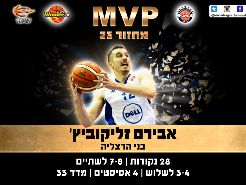 זליקוביץ' הוביל את קבוצתו לניצחון בית משכנע על האקסית שלו הפועל "SP מצרפלס" ת"א, כשהוא קולע 28 נקודות ב-26 דקות באחוזים פשוטים מדהימים: 7 מ-8 לשתיים, 3 מ-4 לשלוש ו-5 מ-6 מהקו. הוא הוסיף ארבעה אסיסטים וסחט 6 עבירות בדרך למדד 33, השני הכי גבוה שלו העונה, ועזר לבני הרצליה לשמור על המקום הרביעי בטבלה.
