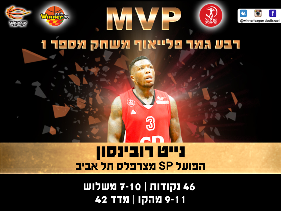 לא כל יום יוצא לנו לבחור מצטיין מחזור מקבוצה שהפסידה, אבל גם לא כל יום יוצא לנו לראות כזו הופעה. נייט רובינסון קלע 46 נקודות עבור הפועל "SP מצרפלס" ת"א וכמעט עצר את רצף הניצחונות של הפועל "בנק יהב" ירושלים, אבל האלופה הצליחה לשרוד מותחן גדול לאחר הארכה ולנצח 97:99 במשחק מס' 1 של רבע הגמר.