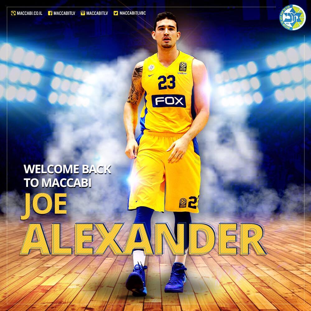 מכבי "FOX" ת"א הודיעה היום (רביעי) על החתמתו של ג'ו אלכסנדר (29, 2.03 מ') לעונה אחת עם אופציה לעונה נוספת. "אני שמח לחזור", סיפר הפורוורד המתאזרח לאתר הרשמי של הצהובים, "נהניתי בפעם הראשונה שלי בתל אביב ואני נרגש להגיע שוב למכבי. זהו מקום מאוד מיוחד, עם אוהדים חמים ונאמנים ומסורת מפוארת, וזו בהחלט גאווה להיות שוב חלק מהמועדון הזה".