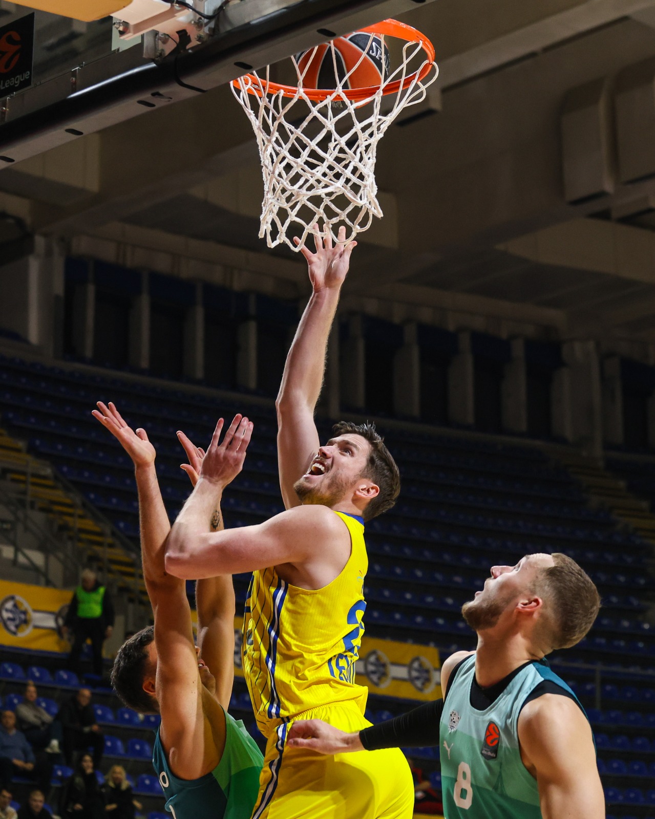 מכבי "Rapyd" ת"א התאוששה מארבעה הפסדים רצופים במפעל עם 83:89 קשה על בסקוניה בבלגרד, ועקפה אותה בטבלה עם מאזן זהה. 19 לליף (צילום: דראגן טשיץ')