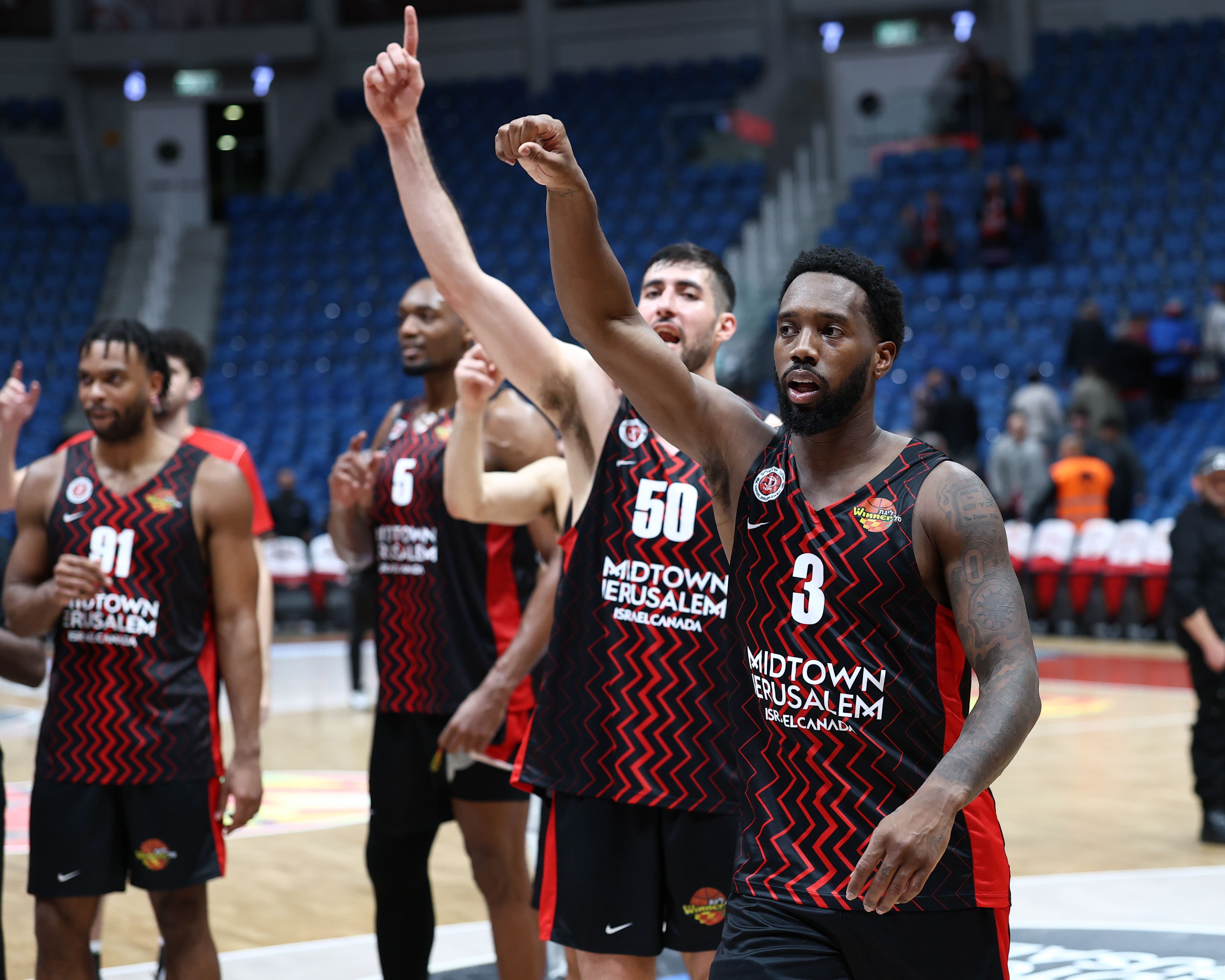 שחקני ירושלים מודים לקהל בסיום. ניצחון שישי רצוף בכל המסגרות (צילום: דני מרון)