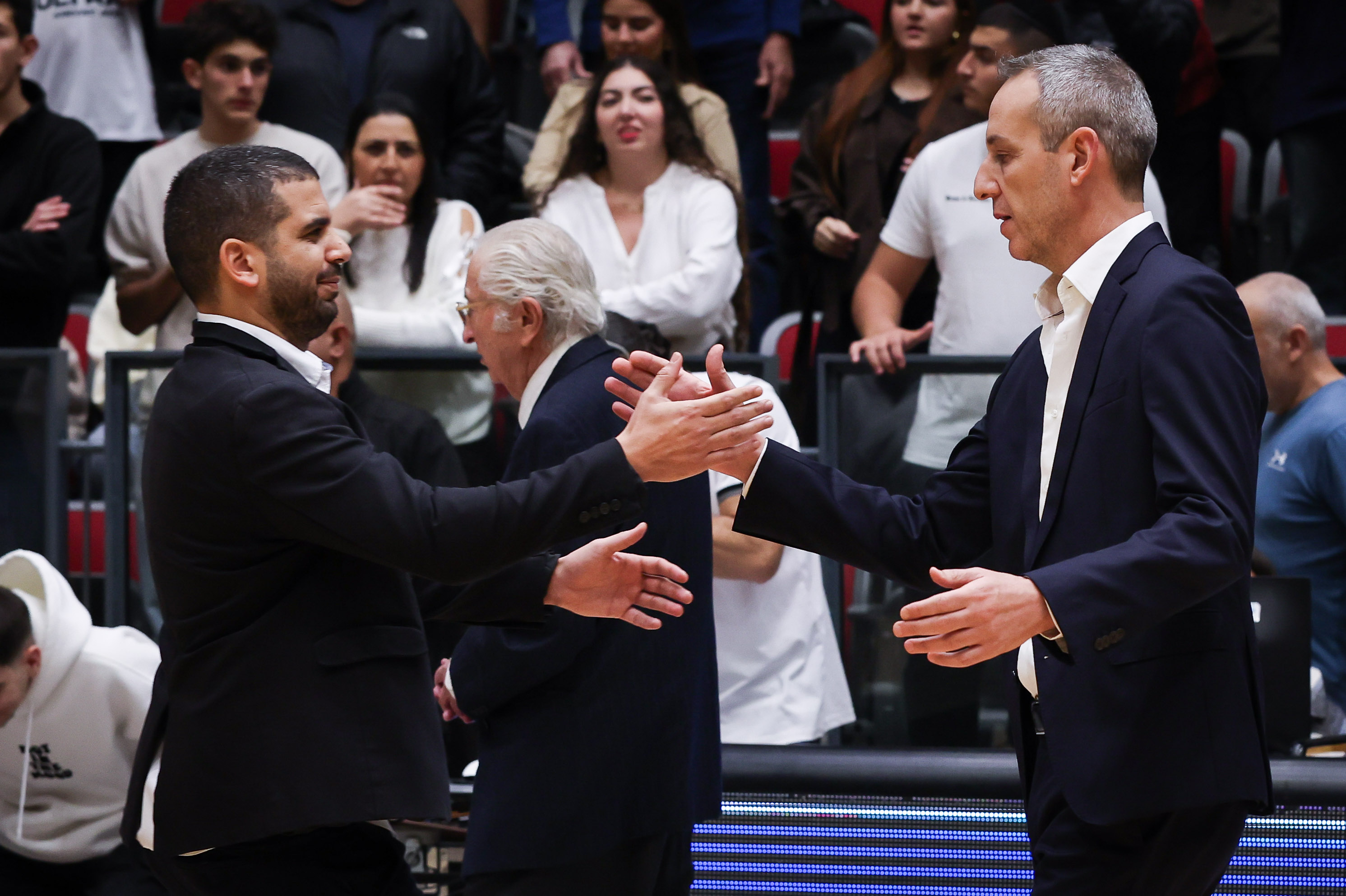 לחיצת היד המסורתית בין המאמנים לפני פתיחת ההתמודדות (צילום: מאור אלקסלסי)