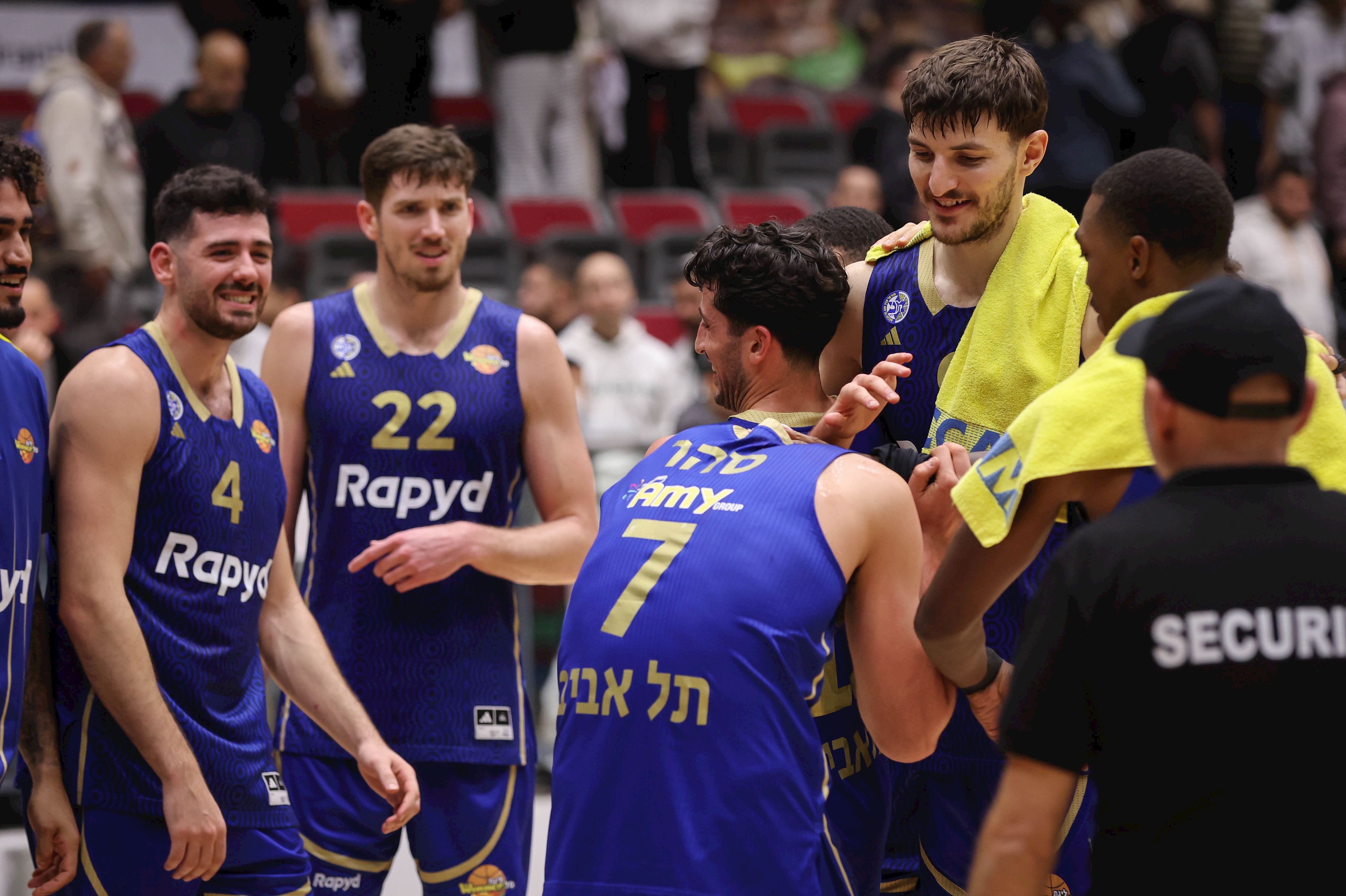 שחקני מכבי תל אביב חוגגים ניצחון תשיעי רצוף בכל המסגרות (צילום: מאור אלקסלסי)