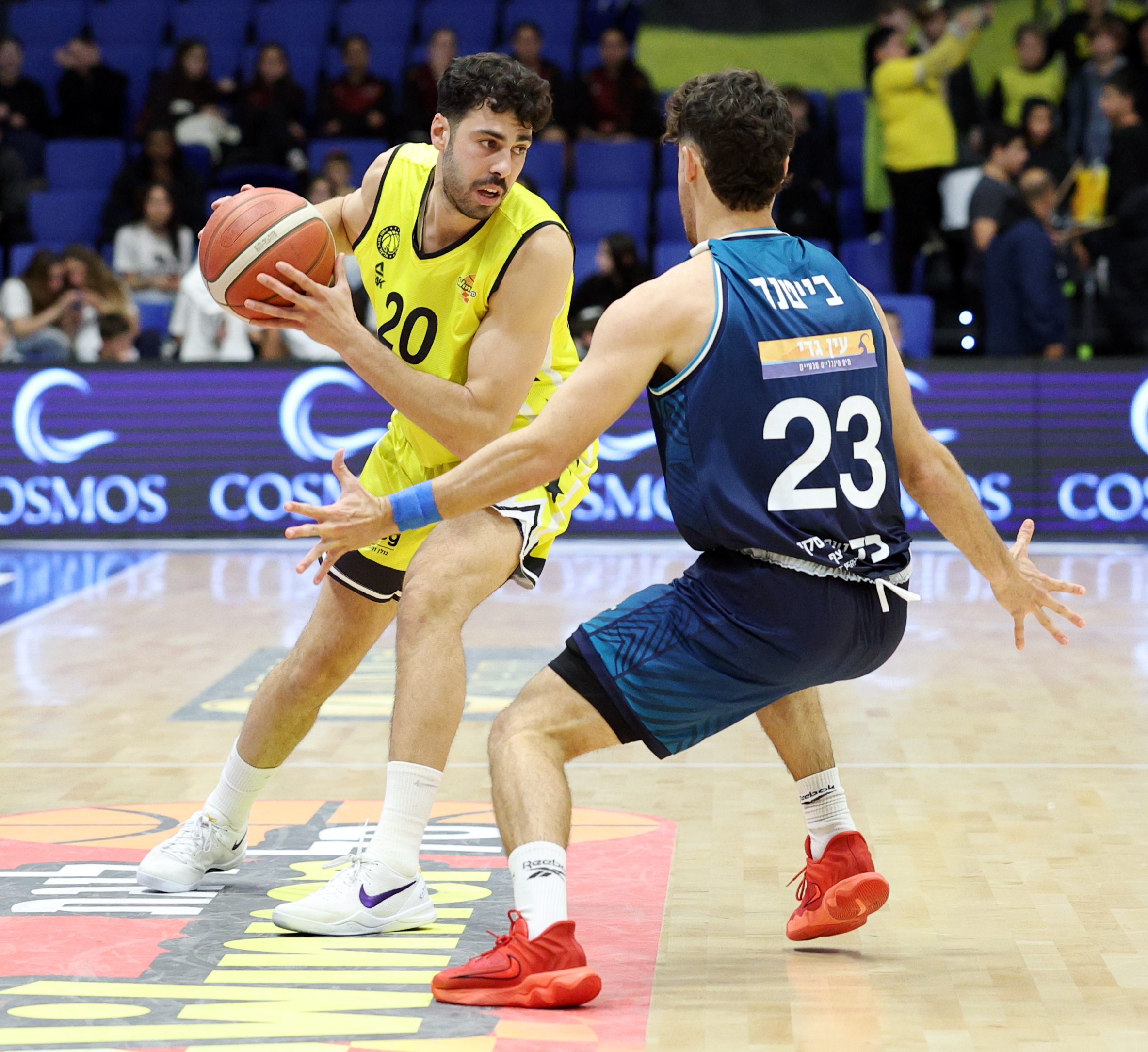 המארחת בצהוב פתחה עם ביוקנן, גרשון, פרייז'ר, אונגנדה וקרבאצ'ו, ואילו האורחת בכחול עלתה עם אסייג, ניל, לוק, יום והול. הרבע הראשון סיפק כדורסל קצבי ומלהיב – וגם מהלך אחד מרהיב של אונגנדה. הביג-מן של נתניה חסם בצד אחד את הול, טס את המגרש לצד השני וניצל אסיסט של ספיר לדאנק מהדהד על הראש של יום. למרות הביצוע היפהפה הזה, קריית אתא היא זו שסיימה את הרבע ביתרון 21:24, בעיקר בזכות שש נקודות כל אחד של יום ולוק. ברבע השני גם הול נכנס לעניינים ועם ארבע נקודות רצופות הוא הוביל את האורחת ליתרון 34:40 – הפער הגבוה ביותר של מי מהקבוצות במהלך המחצית הראשונה. המארחת לא נבהלה ובהובלת פרייז'ר היא לא אפשרה ליריבתה לברוח ועד ההפסקה השוותה את התוצאה. 43:43 בתום 20 דקות של כדורסל.