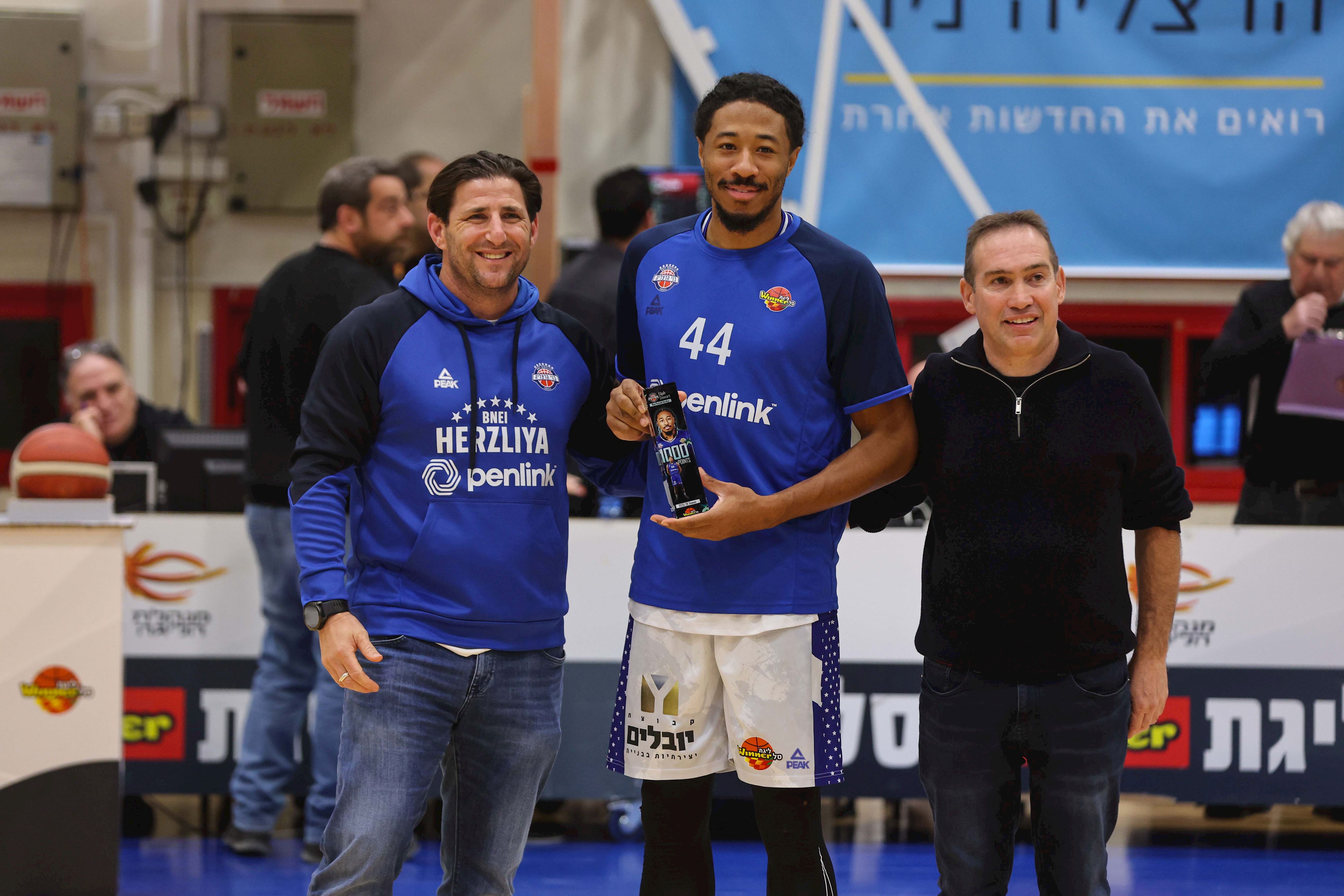 סטיוארט מקבל תשורה לרגל הגעתו ל־1,000 נקודות בליגת ווינר סל (צילום: לירון מולדובן)