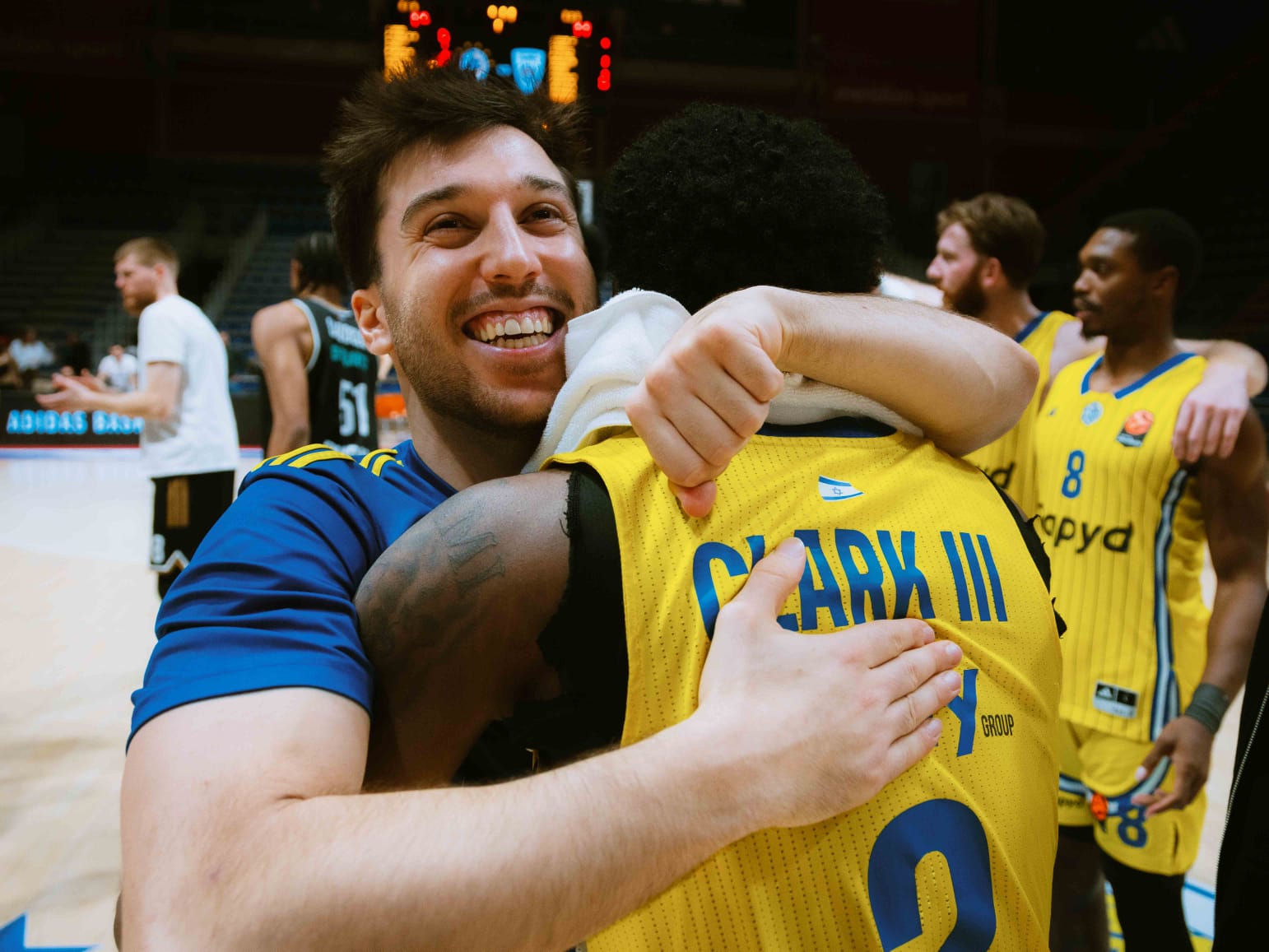 בלאט מחבק את קלארק, שהוביל את הצהובים עם דאבל־דאבל מרשים (צילום: ג'ורג'ה קוסטיץ')